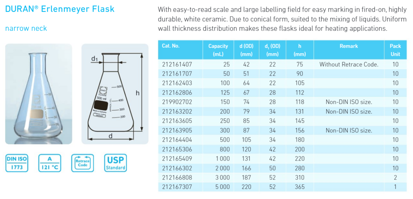 Flask Erlemmeyer, narrow mouth, Schott DURAN